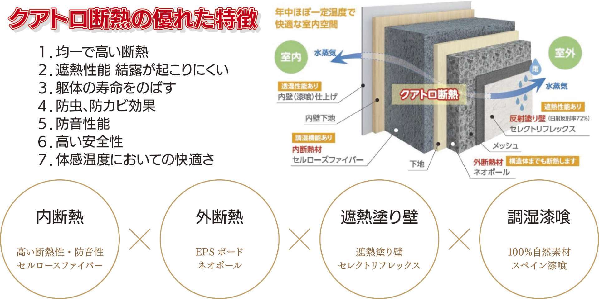 クアトロ(4層)断熱とは、「断熱」「遮熱」「調湿」「透湿」という 4つの性能を持った工法で、「呼吸する家」を実現します。内部結露の発生を防ぎ住む人の健康はもちろん、暑さ寒さから住宅そのものも守ります。