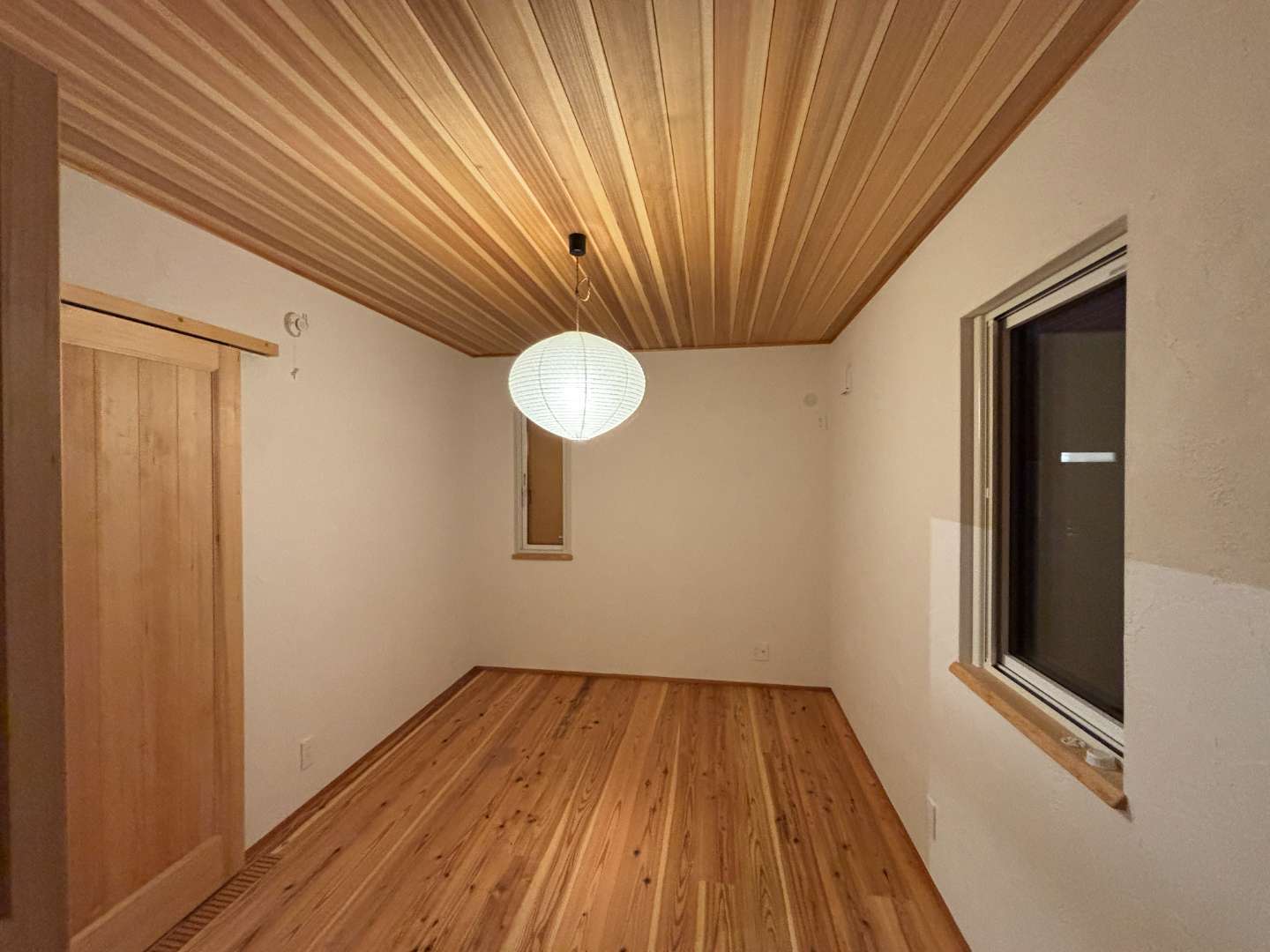床材には桧の無地無垢板や杉の浮造り板を使用し、壁・天井にも杉の無垢板を張り、屋根下地の野地板も合板ではなく、無垢の杉板を使用したことで、家全体が自然素材のやさしい質感に包まれています。屋根の樋も塩ビ管ではなく、金属製樋を選ばれる徹底ぶり