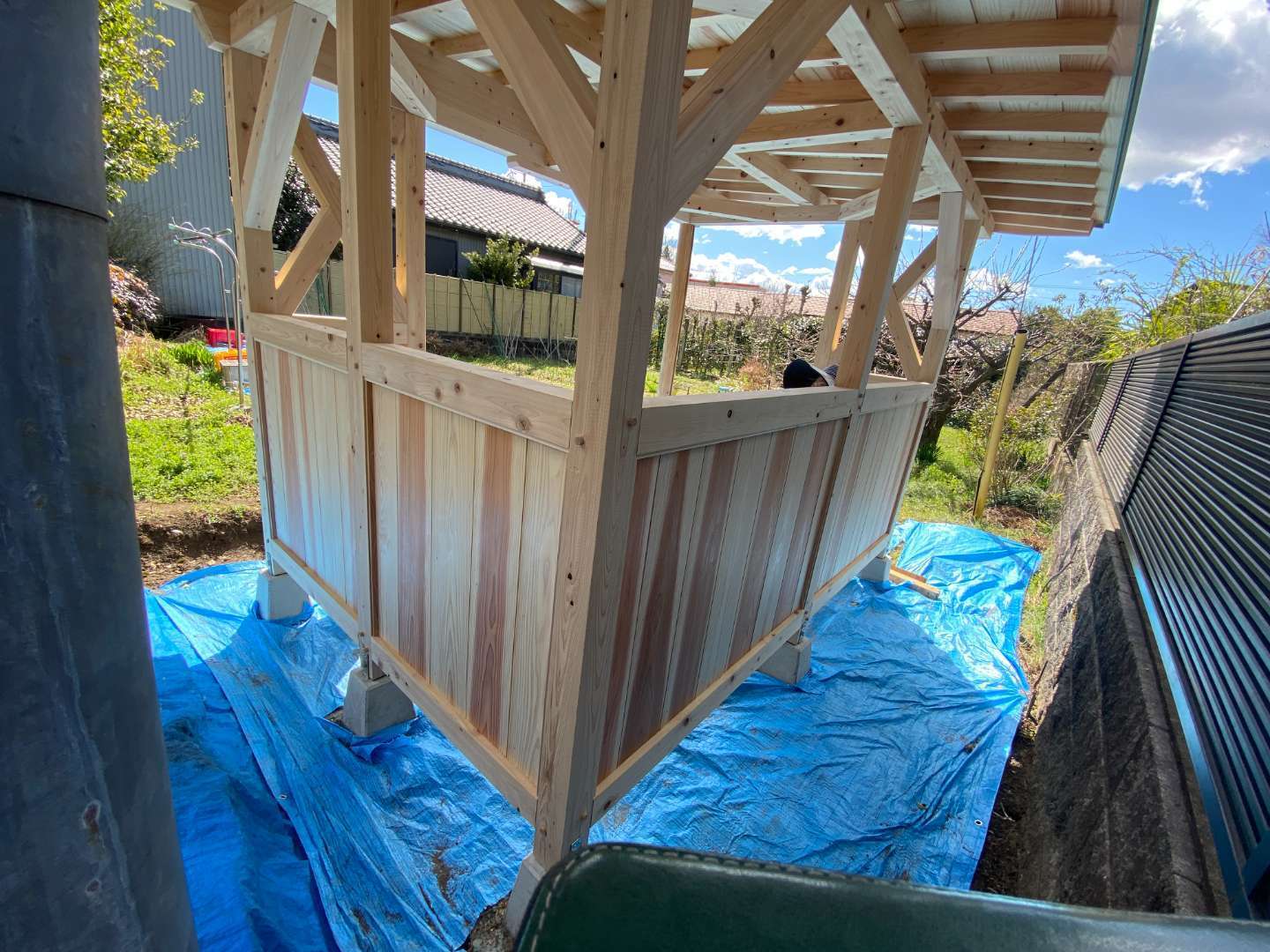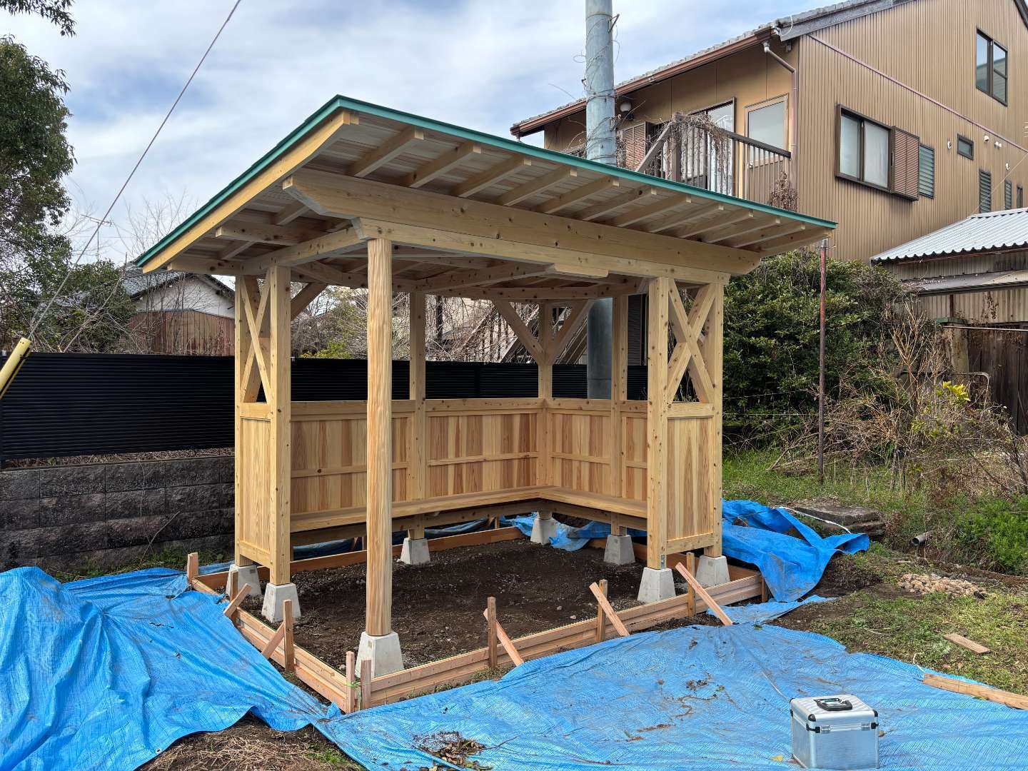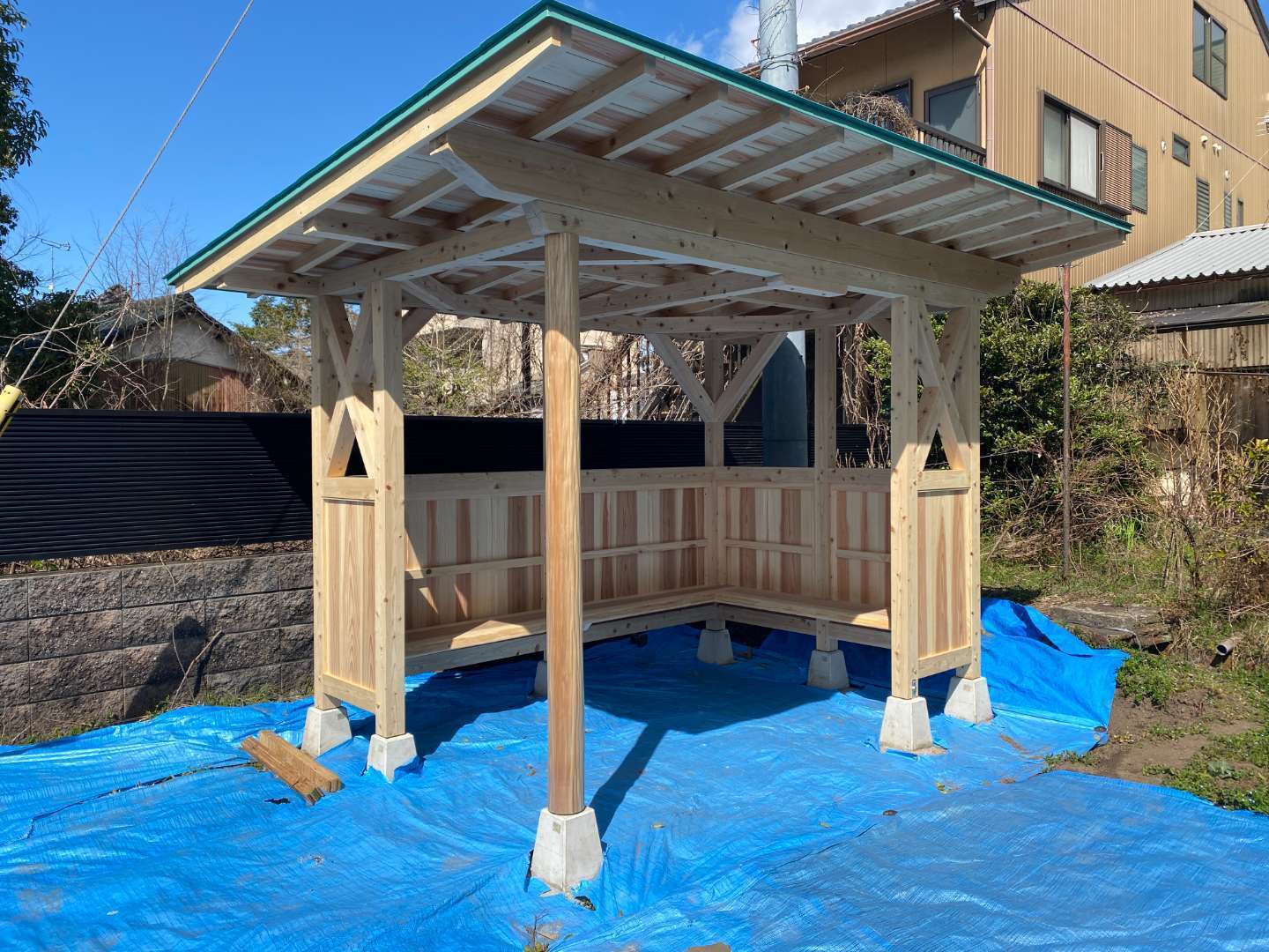 庭先に、農作業の休憩や仲間との語らいを楽しめる木製の休憩小屋を施工しました。