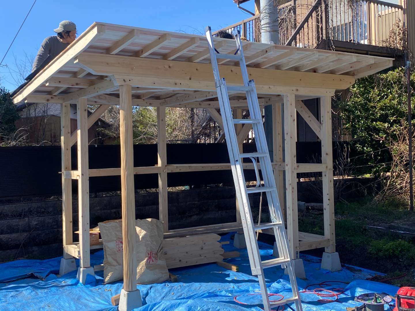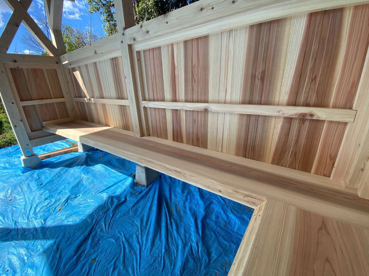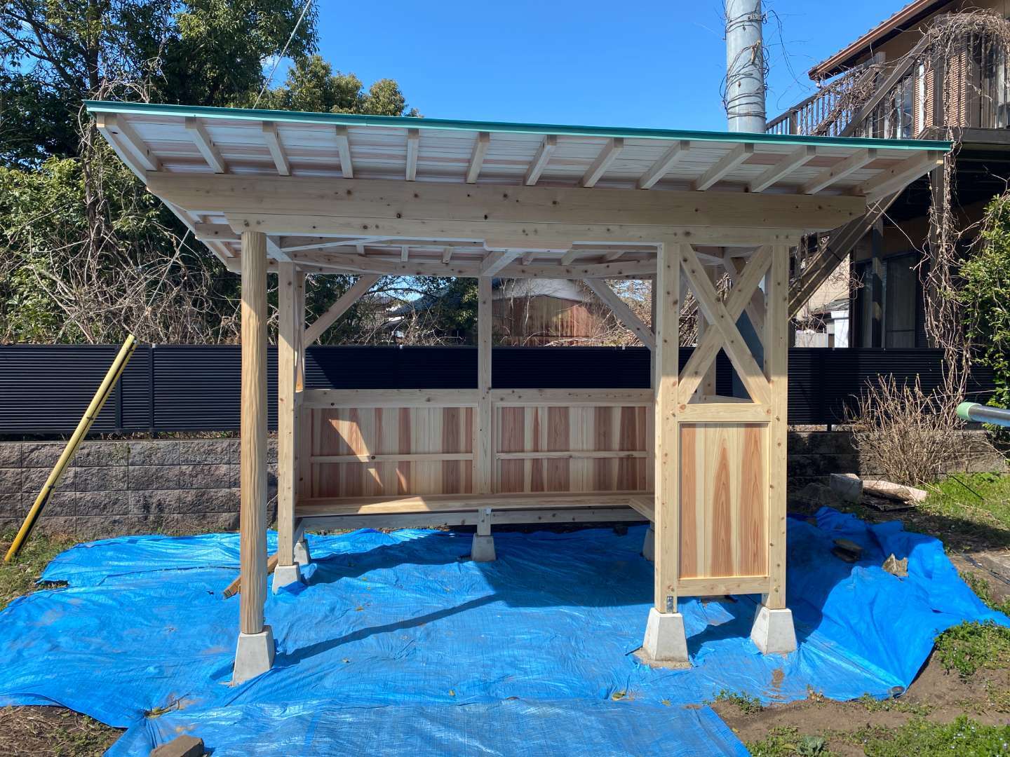 庭先に、農作業の休憩や仲間との語らいを楽しめる木製の休憩小屋を施工しました。